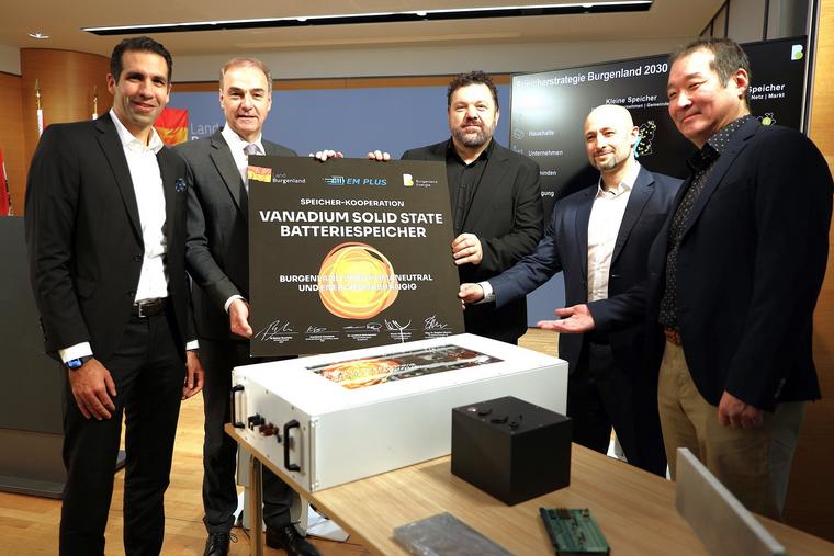 Das Burgenland setzte am 4. Dezember 2025 einen weiteren Meilenstein am Weg zur Energieunabhängigkeit: Der erste Vanadium Solid State Batteriespeicher Österreichs geht in den Probebetrieb und erstmals ans öffentliche Stromnetz. Die innovative Speichertechnologie kommt vollständig ohne Lithium aus und bietet gegenüber klassischen Lithium-Ionen-Systemen deutliche Vorteile in Sicherheit, Leistungsfähigkeit und strategischer Rohstoffverfügbarkeit. Im Rahmen einer Pressekonferenz im Kultur-und Kongresszentrum Eisenstadt präsentierten Landesrat Dr. Leonhard Schneemann, Mag. Dr. Stephan Sharma, Vorsitzender des Vorstandes der Burgenland Energie, Forschungskoordinator Martin Zloklikovits sowie Rainer Svacinka, CEO der EM PLUS GmbH Güssing, das Projekt und seine Bedeutung für Forschung, Wirtschaft und Energiesicherheit im Burgenland. „Der heutige Probebetrieb des Vanadium Solid State Batteriespeichers ist ein starkes Zeichen: Das Burgenland wird ein Ort, an dem zukunftsweisende Technologien ankommen, geprüft, verbessert und in Richtung Marktreife begleitet werden. Wir holen Zukunftstechnologien ins Burgenland, wir erproben sie hier und entwickeln sie gemeinsam mit unseren Forschungsakteuren weiter. Damit stärken wir Innovation, Wertschöpfung und Energiesicherheit in unserer Region“, betont Landesrat Dr. Leonhard Schneemann.